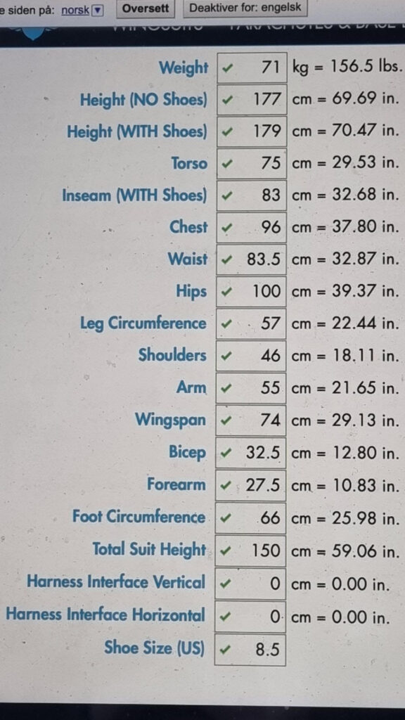 Squirrel Creature wingsuit i svært god stand. Drakten er sydd til 177cm og 77kg. Vedlagte mål ligger i størrelsesguide.
