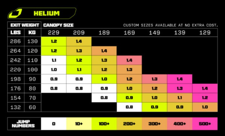Helium er tilgengelig i størrelsene 129-229sqf. Skjermen er designet for en WL mellom 0,8-1,4 og passer tyngre hoppere som ønsker en skjerm som passer i en mindre rigg, eller mindre hoppere som ønsker stabiliteten til en større skjerm. Skjermen er svært stabil og myk ved lett WL. Ved høyere WL er den effektiv, men likevel tilgivende. Egner seg fint for nybegynnere. Helium blir levert med Vectran 500 eller Vectran 750. Vi anbefaler Vectran 500 for å få maks ut av et lite pakkevolum. For tyngre hoppere anbefales Vectran 750.