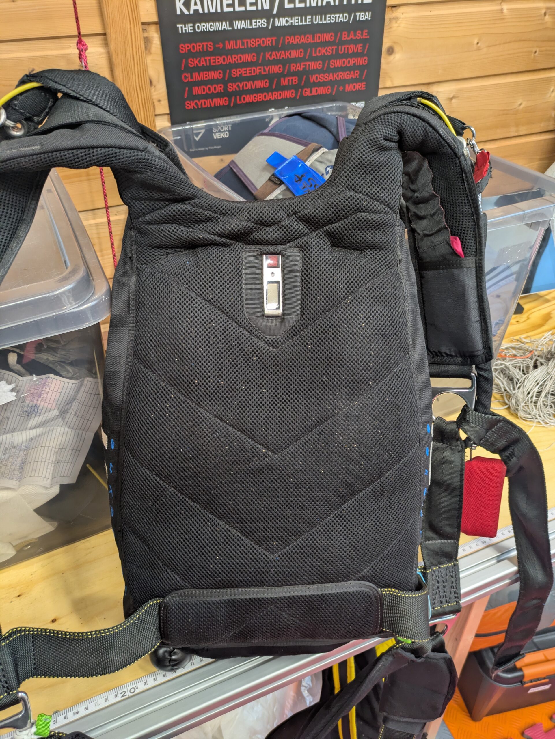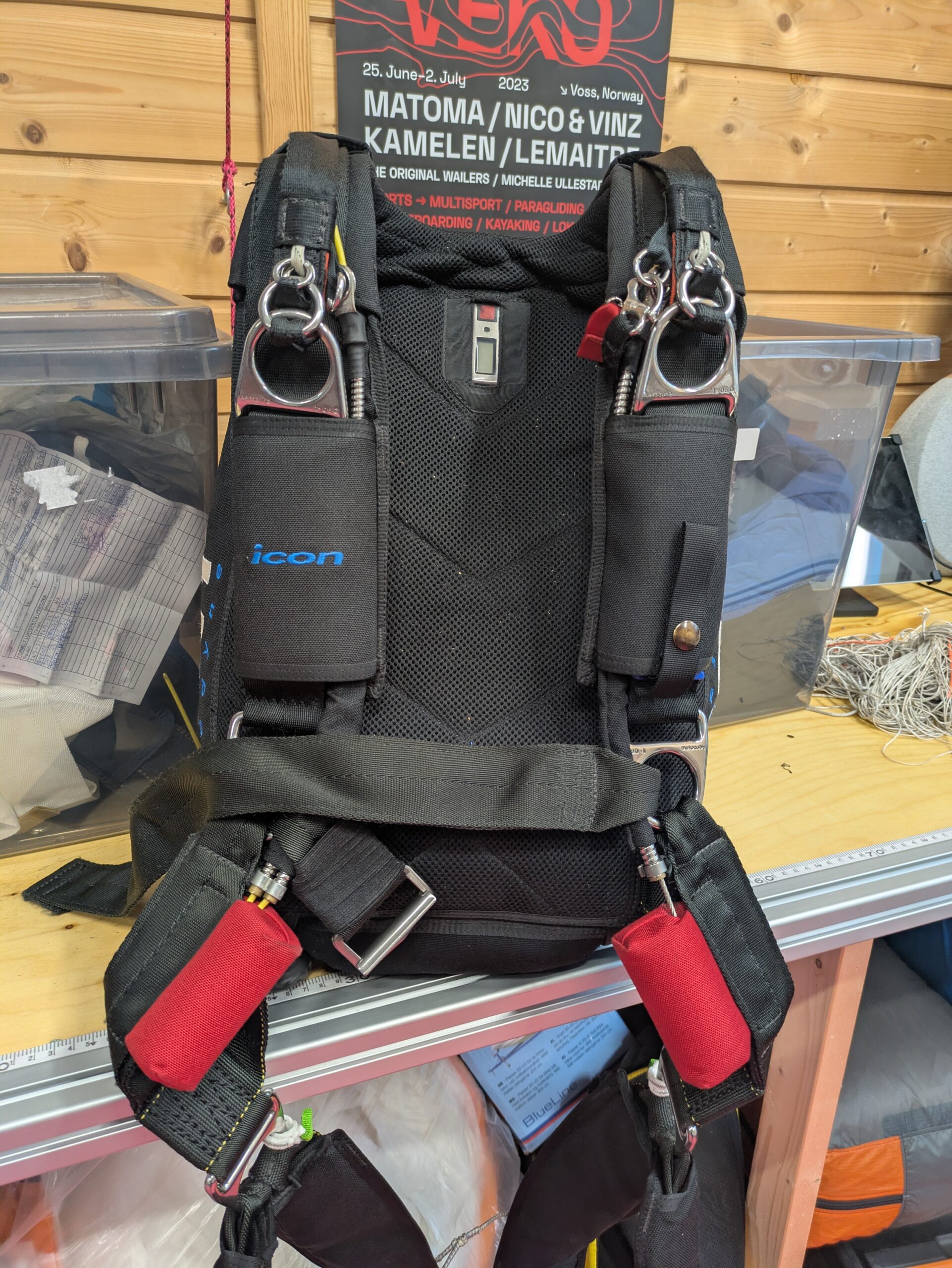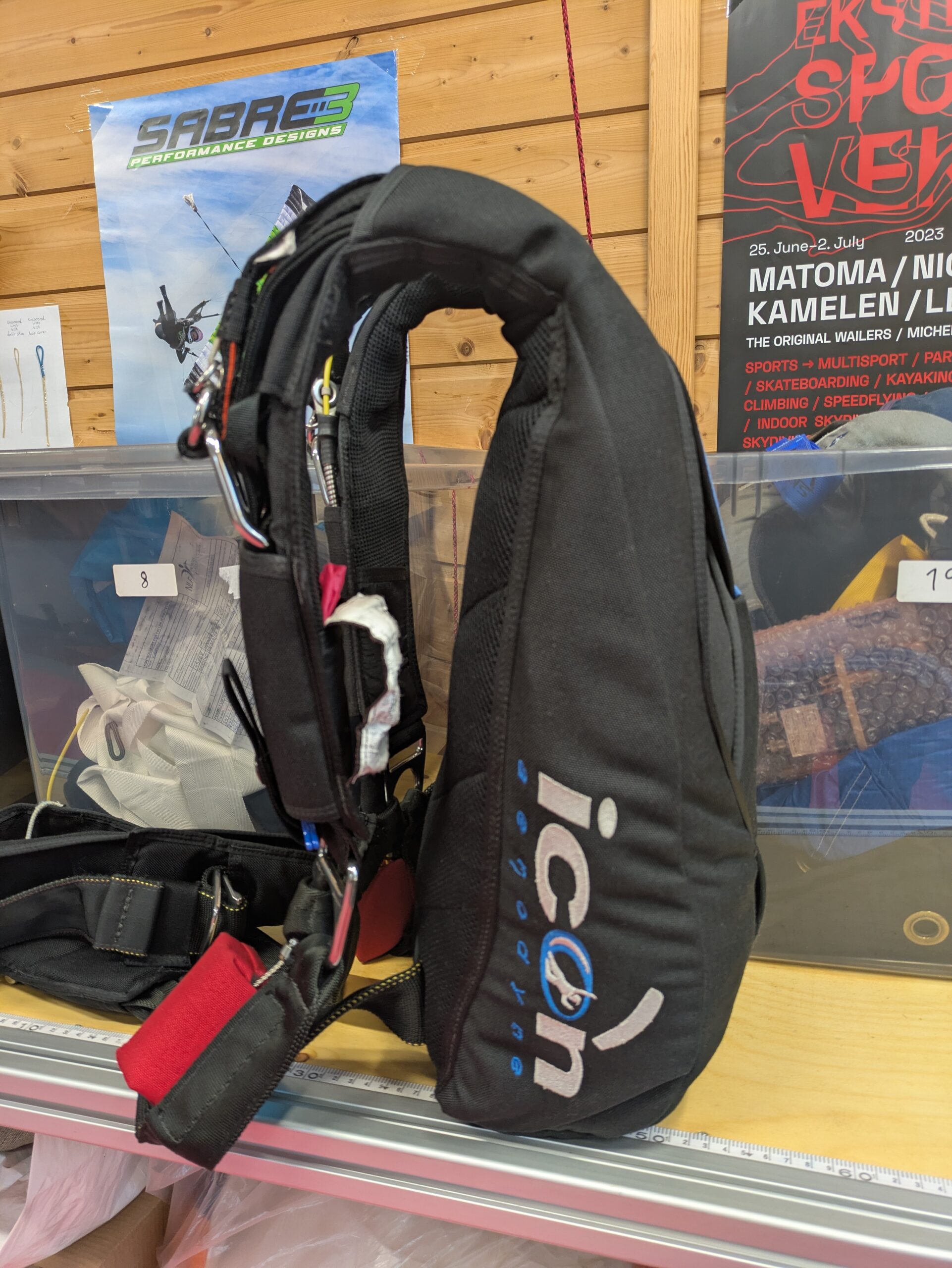 - Aerodyne Icon I3 D.O.M 05/07. Mellom 500-600 hopp. Containeren holder hovedskjermer 120-135 std ZP, samt større LPV skjermer. Passer noen rundt 180cm og 80-85kg.