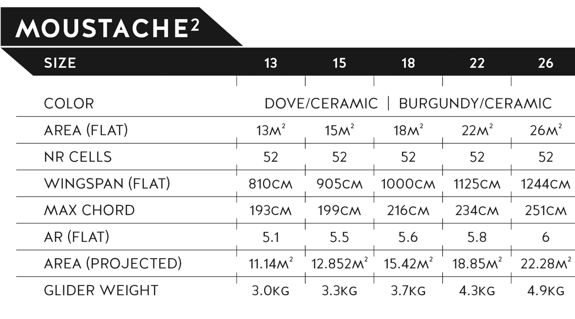 MOUSTACHE² er en videreutvikling av den legendariske MOUSTACHE og er laget for deg som elsker fart, presisjon og friheten til å fly akkurat slik du vil. Vingen gir deg muligheten til å justere glide, løft og fart direkte via bremsene med det unike FLARE Systemet.