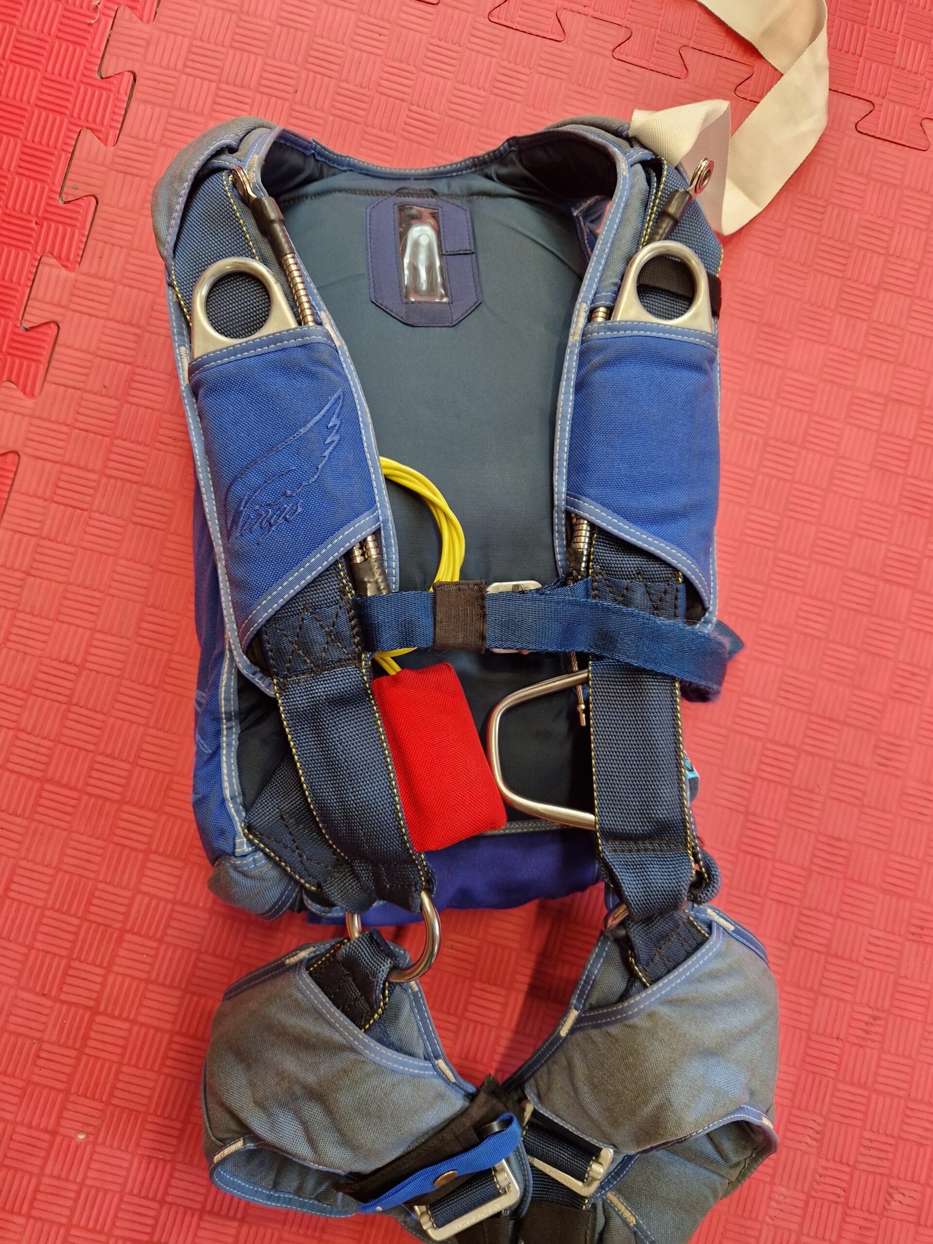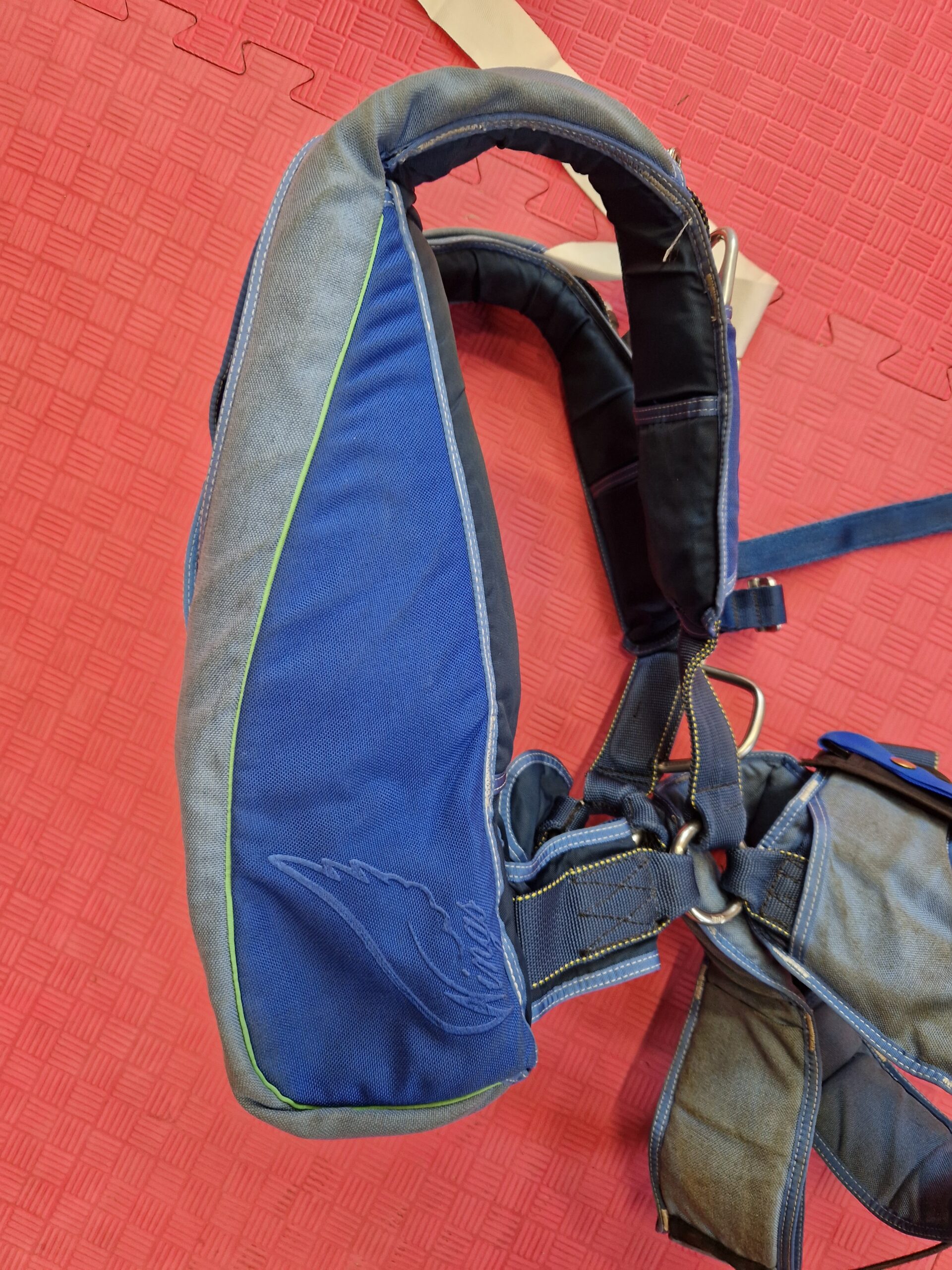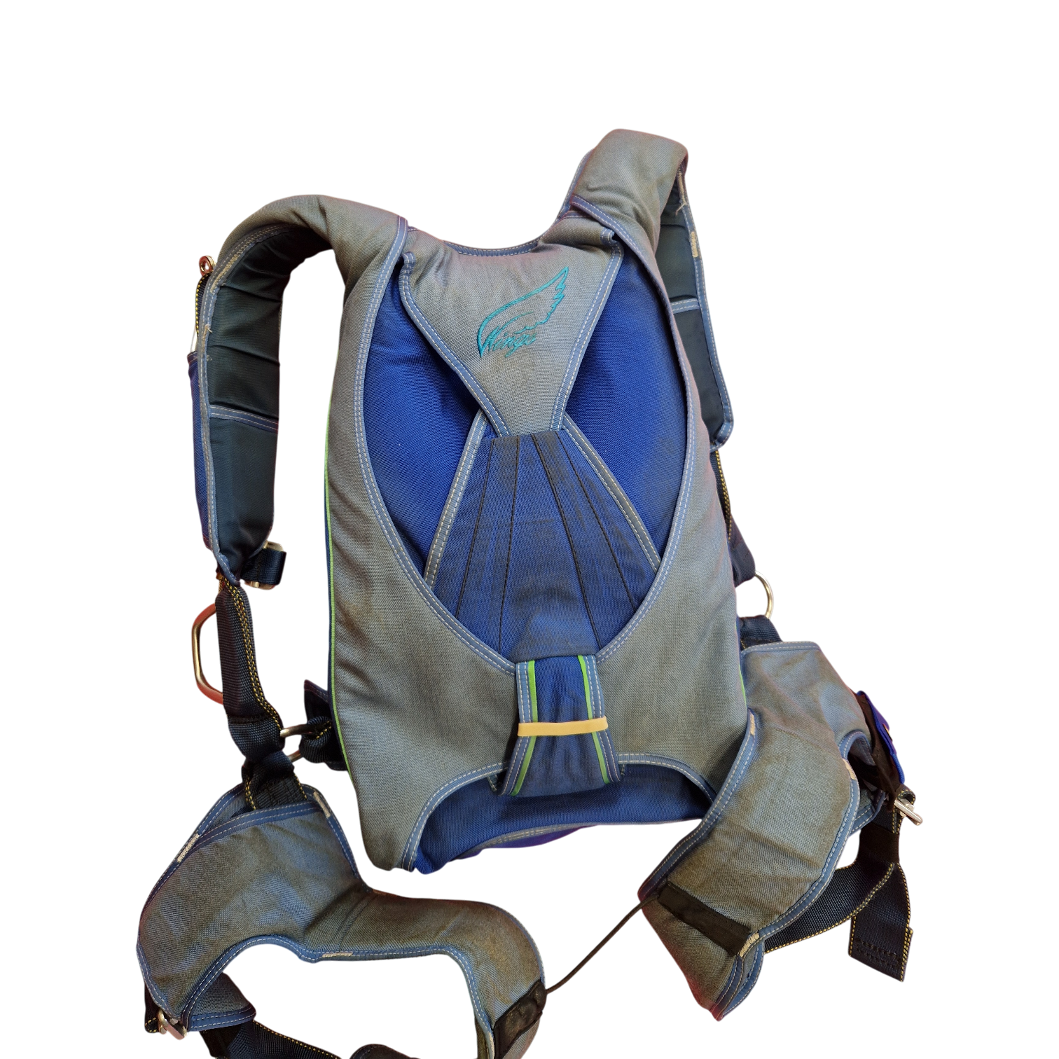 • Wings W5 D.O.M 10/08. Containeren holder hovedskjermer 120-135std ZP og PD reserve 113-126. Seletøyet er i god stand, med noen små kosmetiske frynser på deler av webbingen. Passer noen rundt 165cm og 65kg.